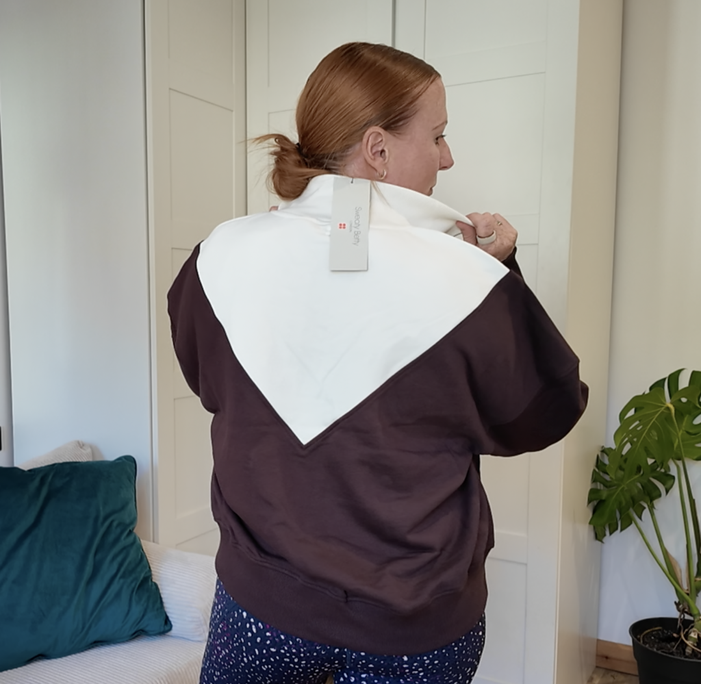 It’s thinner than my Lululemon Scuba, so more of a spring or autumn transitional piece, but it’s beautifully designed with a unique diamond-shaped half-zip detail.