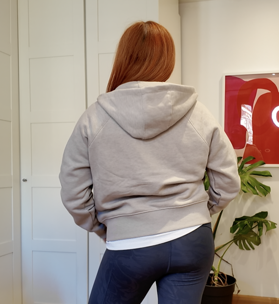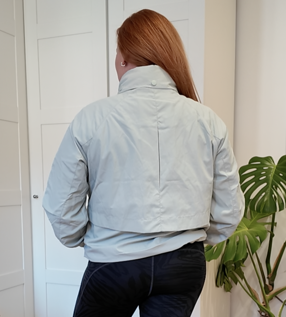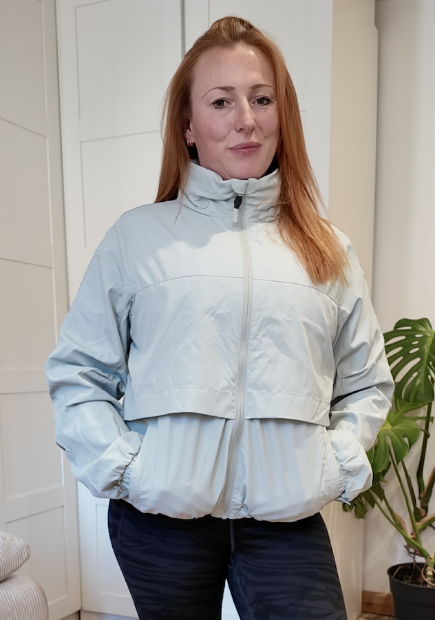 This one is super stretchy and very lightweight — you can actually see the colour of my skin through it, so it’s definitely more of a breathable performance layer rather than a thick “winter top”.