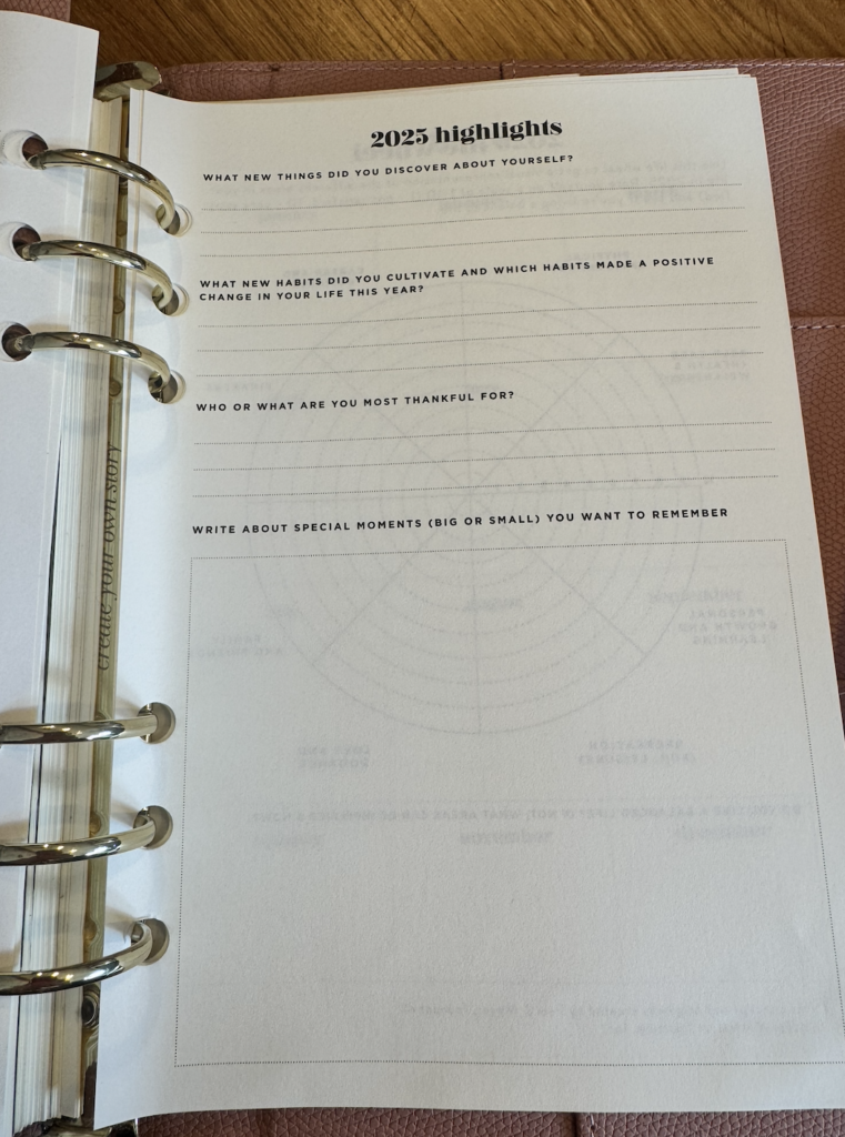 This year, I’m using the Inspired Stories Planner to guide my end‑of‑year reflection and planning for the year ahead. I love it because it’s structured but not rigid — it asks the right questions without feeling overwhelming or prescriptive. I bought the filofax version last year, so that I can now just purchase the infills each year. It’s a beautiful planner that has all the sections that I need and have used for many years.